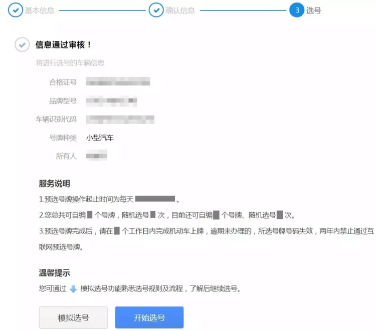 系統(tǒng)核查通過后會(huì)進(jìn)入選號(hào)服務(wù)說明,用戶可以看到之前提交的信息,閱讀服務(wù)說明后,點(diǎn)擊"開始選號(hào)"按鈕開始進(jìn)行選號(hào)操作。