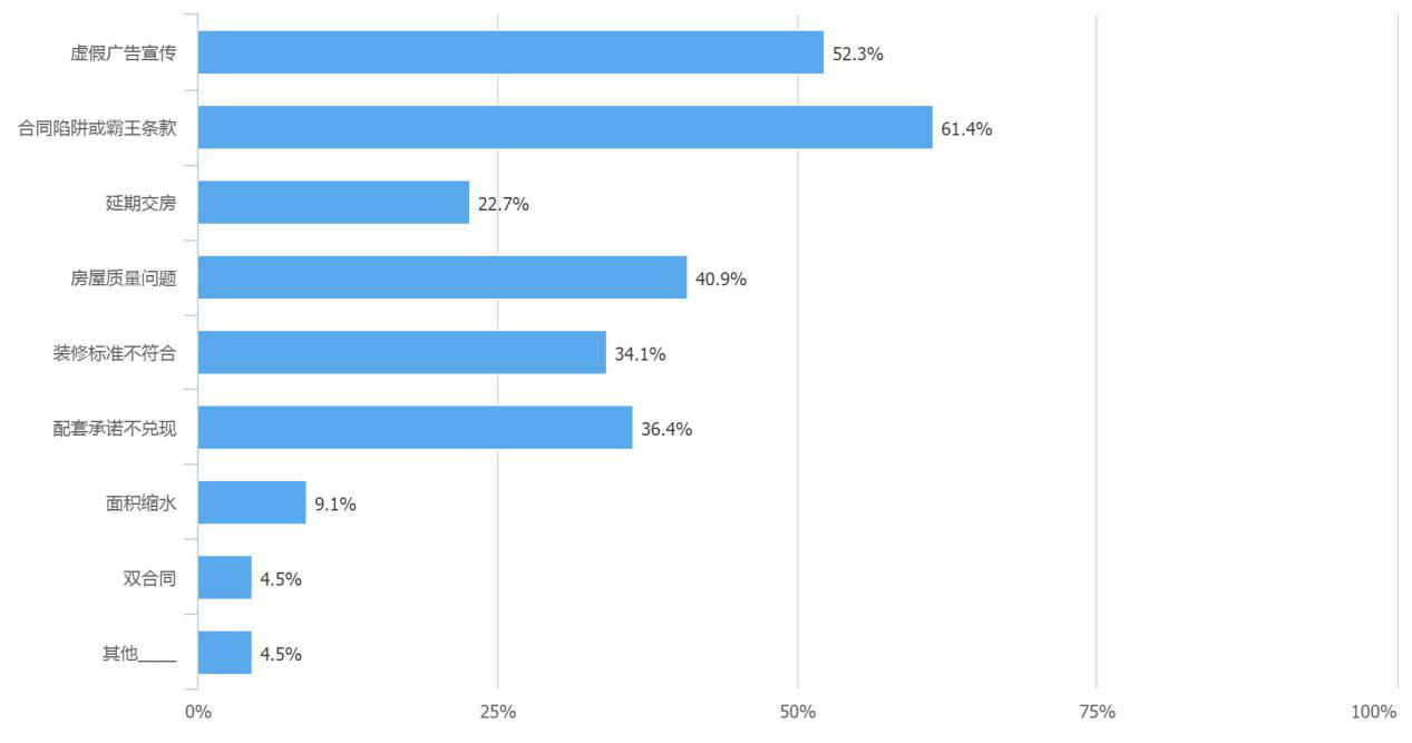 調(diào)查結(jié)果顯示,房產(chǎn)糾紛主要集中在購買一手房、二手房和房屋裝修上,分別占比38.6%、27.3%、27.3%,而且將近70%的消費(fèi)者對房產(chǎn)交易過程中的相關(guān)知識和風(fēng)險(xiǎn)只是了解一般。同時,消費(fèi)者在新建商品房和二手房交易過程中遇到的糾紛在問卷結(jié)果中顯示都是多方面的。其中,新建商品房交易陷阱主要是“合同陷阱或霸王條款”、“虛假廣告宣傳”;二手房交易陷阱主要是“隱瞞房屋缺陷”。針對如何避免購房糾紛,50%以上的消費(fèi)者認(rèn)為“購房前咨詢朋友、專家”和“購房前多學(xué)習(xí)房產(chǎn)知識,防止受騙”是最好的辦法。