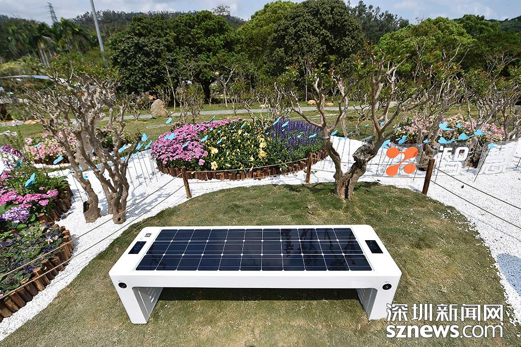 智能座椅被放置在花園中,該座椅利用太陽(yáng)能發(fā)電,可以進(jìn)行無線和有線充電