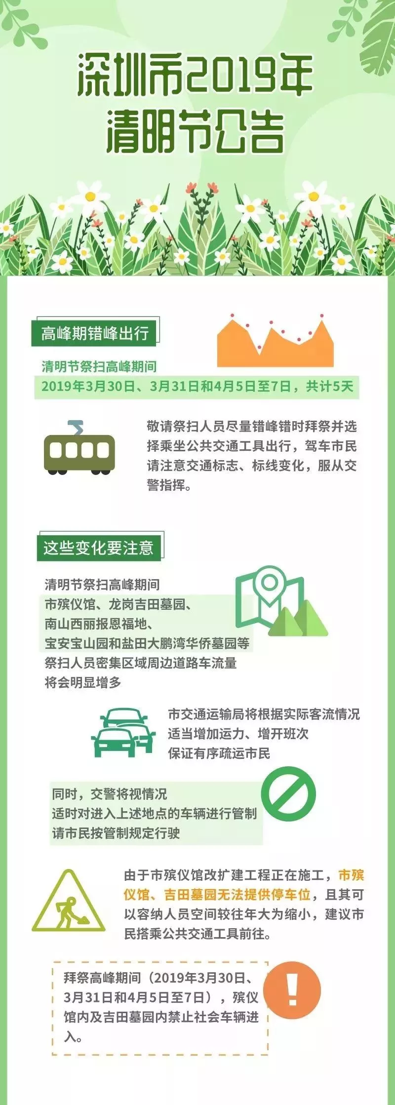 交警部門將視情況對上述地點進行交通管制,為滿足市民朋友出行祭掃需要,除了給大家準備出行指引外還將開行墓園接駁專線、增加??空尽⒃黾舆\力請大家文明出行、綠色出行。