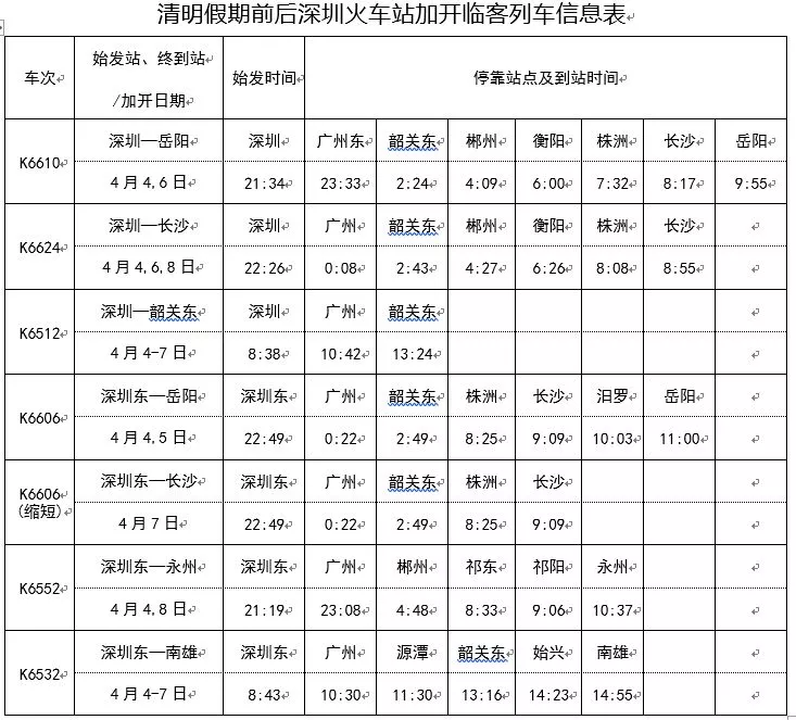 深圳站將加開3對臨客列車,始發(fā)車次為開往岳陽的K6610次、開往長沙的K6624次和開往韶關(guān)東的K6512次;