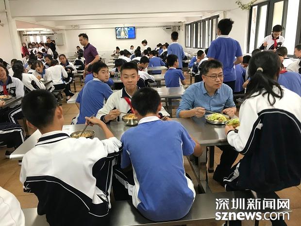 4月1日中午,深圳市福田區(qū)外國(guó)語(yǔ)學(xué)校校長(zhǎng)丁長(zhǎng)義跟學(xué)生一起在食堂就餐