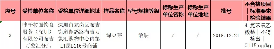 食用農(nóng)產(chǎn)品也有1批次檢出不合格,不合格樣品為綠豆芽,不合格項目為4-氯苯氧乙酸鈉。