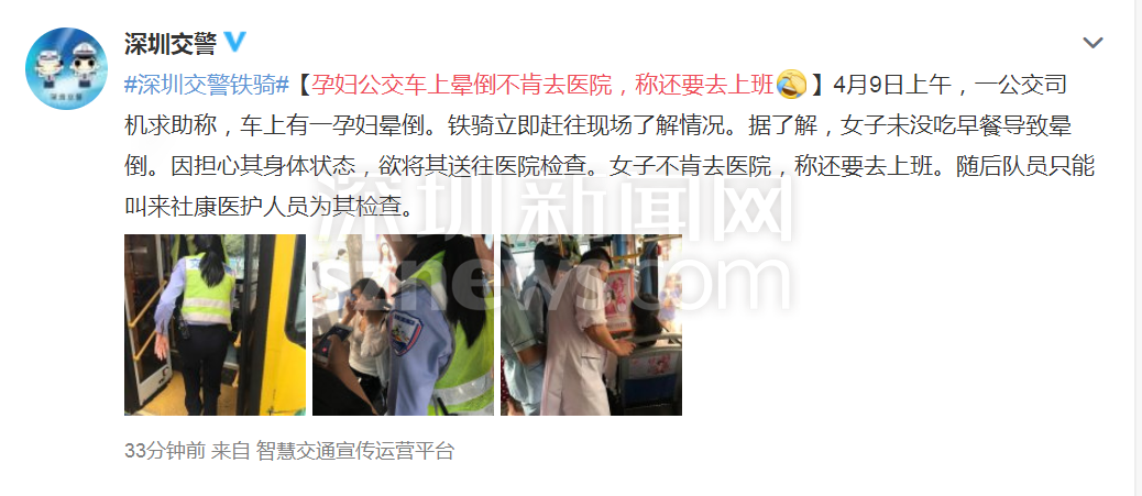 深圳新聞網(wǎng)2019年4月9日訊(記者 施冰冰)記者從“深圳交警”處了解到,4月9日上午,有公交司機(jī)求助稱,車上有一孕婦暈倒。鐵騎立即趕往現(xiàn)場(chǎng)了解情況。據(jù)了解,女子未沒吃早餐導(dǎo)致暈倒。因擔(dān)心其身體狀態(tài),欲將其送往醫(yī)院檢查。女子不肯去醫(yī)院,稱還要去上班。隨后隊(duì)員只能叫來(lái)社康醫(yī)護(hù)人員為其檢查。