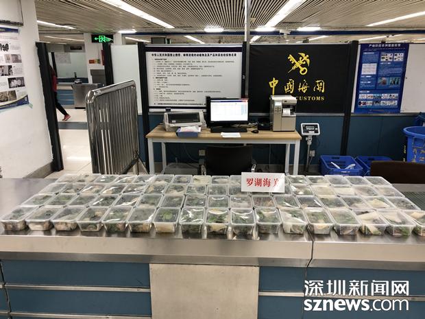 3月21日晚,兩名男性旅客各自提著兩個(gè)外形相似的大行李袋及一副魚竿,從羅湖口岸入境。在對其行李進(jìn)行X光機(jī)檢查時(shí),海關(guān)關(guān)員在機(jī)檢圖像中發(fā)現(xiàn)了異常,圖像顯示四個(gè)袋子中的物品呈現(xiàn)生物特征,而且有若干個(gè)相同的容器包裝著,于是海關(guān)關(guān)員要求兩名旅客打開行李袋進(jìn)行詳細(xì)檢查。