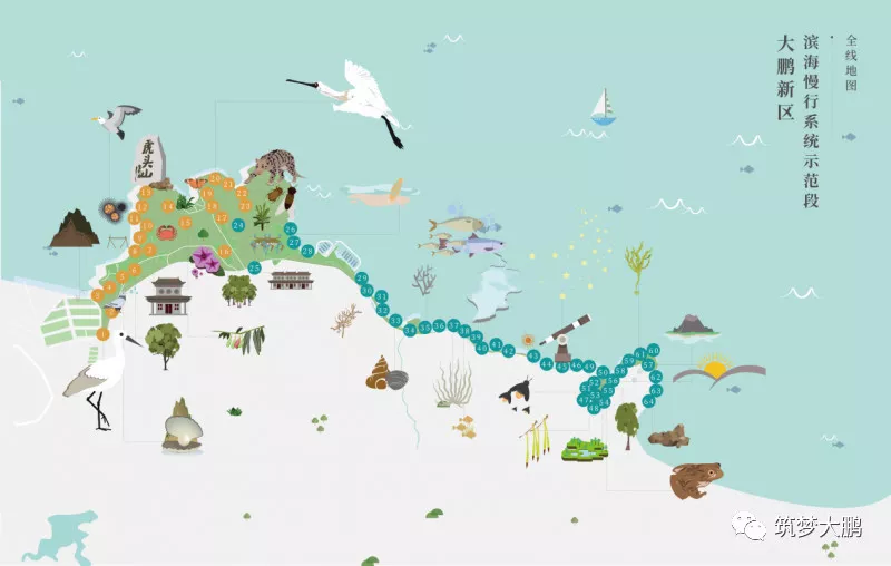 大鵬新區(qū)根據(jù)線路的地形、山海景觀、人文景觀的分布,確定了“打造‘兩線、三段、五大節(jié)點’的濱海生態(tài)自然課堂步道”。據(jù)新區(qū)建筑工務局負責人介紹,從新大河入??诘酱髞啚澈0堵咕讘已?,全長18.7公里的海岸線上分布著河流、山林、海灘、溪流、濕地等多樣生態(tài)系統(tǒng)。2017年7月,大鵬新區(qū)按照濱海慢行系統(tǒng)示范工程標準,動工建設新大-鹿嘴市政綠道。“兩線”指的是沿著海岸的濱海徒步路線和城市二號綠道線,兩條線之間的6.6平方公里土地將形成一座開放的郊野公園;“三段”分別為活力生活段、自然生態(tài)段和休閑旅游段;“五大節(jié)點”為山海綠畔、古廟遺風、東山凹、愛情灘、鹿咀山莊等自然景觀。