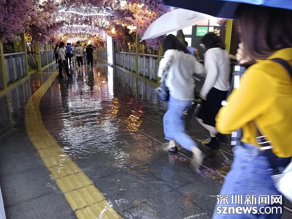 深圳暴雨特效開啟,市民紛紛進入躲雨模式。(記者 邱曉潔 攝于丹竹頭地鐵站)