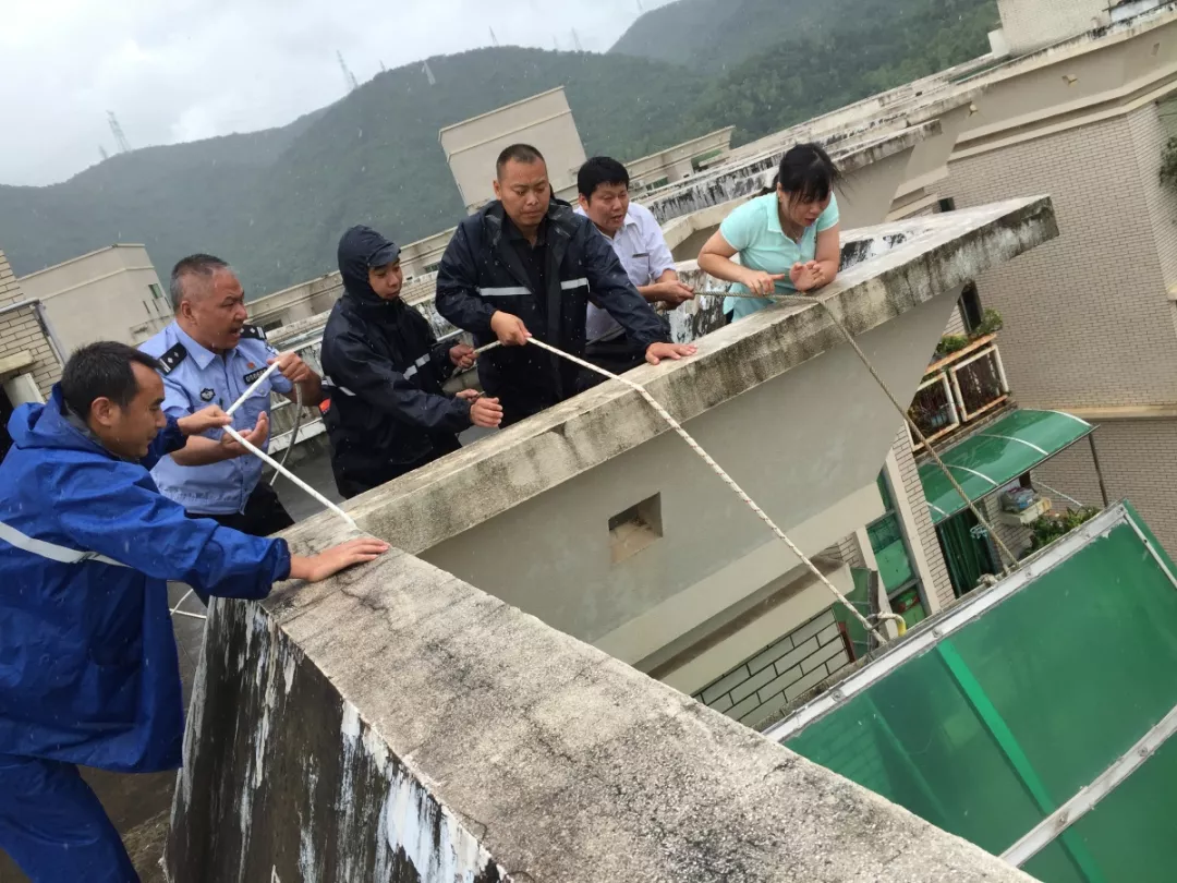 ▲2017年8月23日中午,在福田區(qū)梅林一村88棟,一家住戶的靠墻陽臺頂蓬固定支撐點(diǎn)已全部脫落,導(dǎo)致整個頂蓬向外傾斜,十分危險,福田公安分局梅林派出所民警聯(lián)合社區(qū)居民一起現(xiàn)場處置。