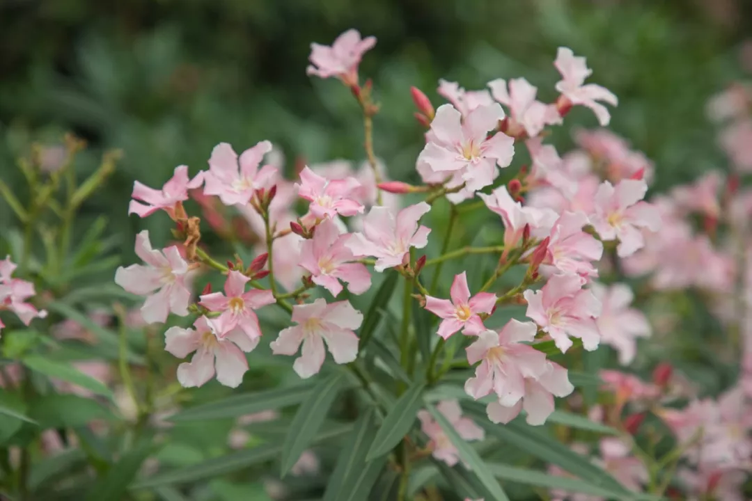 夾竹桃屬常綠直立大灌木,高可達(dá)5米,常見(jiàn)于路邊,花園等地。它的花期很長(zhǎng),幾乎全年,尤其在夏秋開(kāi)的最盛,常見(jiàn)的顏色有粉色、白色、黃色等。