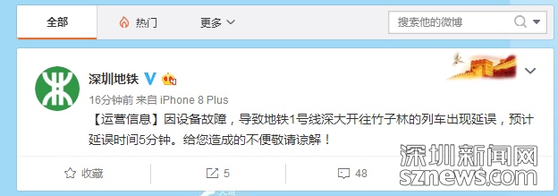這周的星期一,深圳地鐵1號(hào)線深大開往竹子林列車延誤