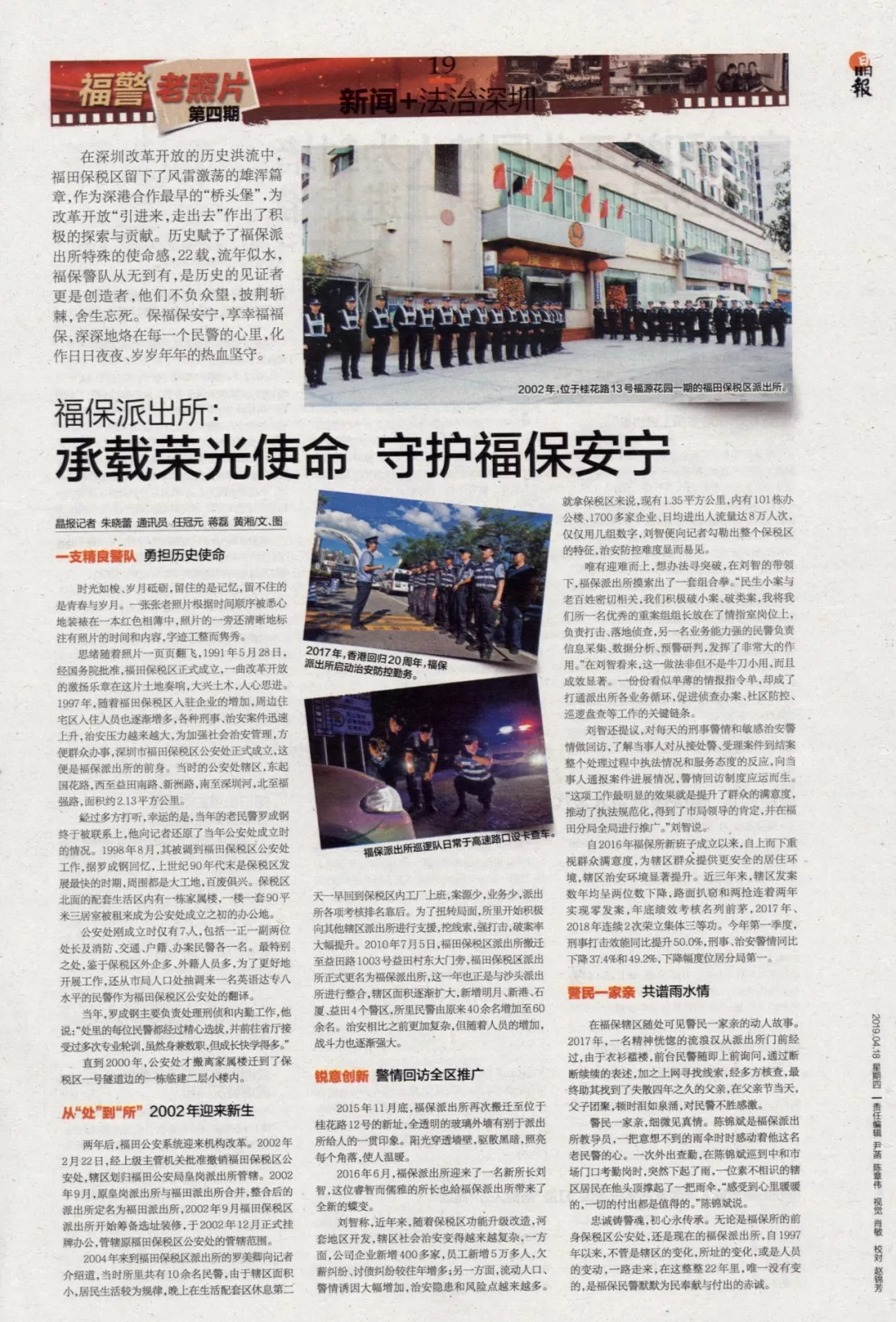 思緒隨著照片一頁(yè)頁(yè)翻飛,1991年5月28日,經(jīng)國(guó)務(wù)院批準(zhǔn),福田保稅區(qū)正式成立,一曲改革開(kāi)放的激揚(yáng)樂(lè)章在這片土地奏響,大興土木,人心思進(jìn)。1997年,隨著福田保稅區(qū)入駐企業(yè)的增加,周邊住宅區(qū)入住人員也逐漸增多,各種刑事、治安案件迅速上升,治安壓力越來(lái)越大,為加強(qiáng)社會(huì)治安管理,方便群眾辦事,深圳市福田保稅區(qū)公安處正式成立,這便是福保派出所的前身。當(dāng)時(shí)的公安處轄區(qū),東起國(guó)花路,西至益田南路、新洲路,南至深圳河,北至福強(qiáng)路,面積約2.13平方公里。