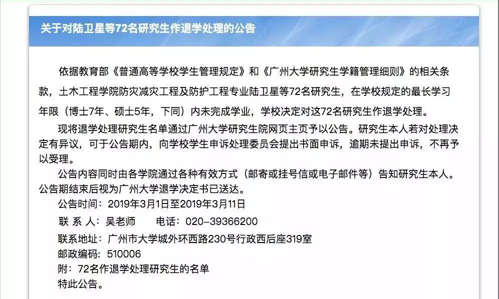 72名研究生在學(xué)校規(guī)定的最長學(xué)習(xí)年限(博士7年、碩士5年,下同)內(nèi)未完成學(xué)業(yè),學(xué)校決定對這72名研究生作退學(xué)處理。