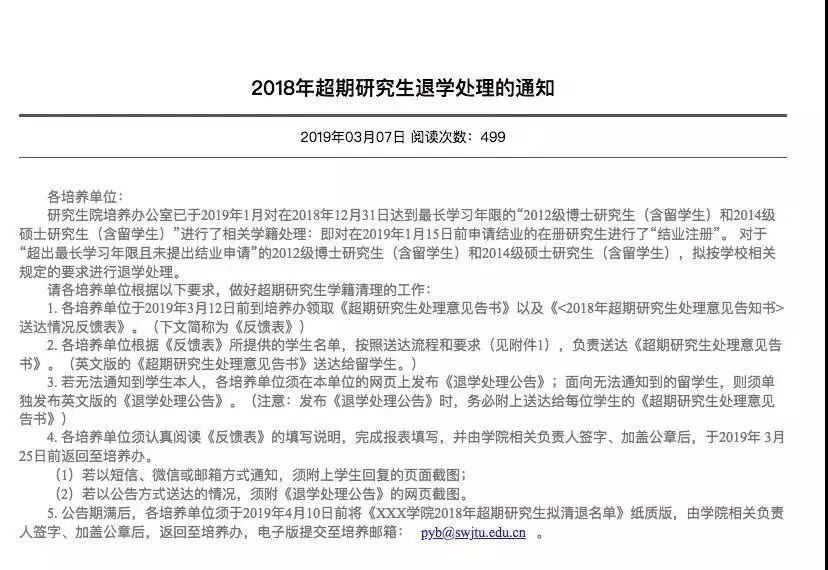 對于"超出最長學(xué)習(xí)年限且未提出結(jié)業(yè)申請"的2012級(jí)博士研究生(含留學(xué)生)和2014級(jí)碩士研究生(含留學(xué)生),擬按學(xué)校相關(guān)規(guī)定的要求進(jìn)行退學(xué)處理。