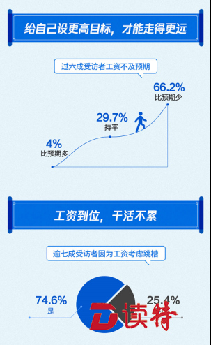 報告顯示,受經(jīng)濟(jì)環(huán)境等因素影響,過六成受訪者工資不及預(yù)期,同時,工資水平影響了職場人的職業(yè)規(guī)劃,逾七成受訪者因為工資考慮跳槽;66.2%的受訪者工資水平比預(yù)期少,只有4%的受訪者認(rèn)為工資比預(yù)期多,此外,逾七成受訪者認(rèn)為工資是考慮跳槽的主要因素。