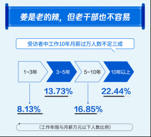 此外,受訪者月薪過萬人數(shù)與隨著工作年限遞增,但工作10年月薪高于1萬的人數(shù)依然不足三成。報告顯示,工作10年以上的受訪者中月薪過萬人數(shù)比例為22.44%、工作5-10年月薪過萬人數(shù)比例為16.85%、工作3-5年月薪過萬人數(shù)比例為13.73%、而工作1-3年月薪過萬人數(shù)比例是8.13%。這也從側(cè)面說明了工作經(jīng)驗不是影響工資水平的唯一因素,想要得到高薪,經(jīng)濟(jì)環(huán)境、工作地域、從事行業(yè)等因素也至關(guān)重要。
