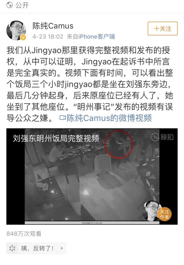 就在人們以為事件就此平息的時(shí)候,又爆出一系列和該案有關(guān)的料。首先是本案當(dāng)事人LIUJINGYAO宣布起訴京東集團(tuán)及劉強(qiáng)東。4月22日、23日微博上爆出監(jiān)控視頻以及劉強(qiáng)東美國(guó)律師和LIUJINGYAO之間電話談話的錄音。
