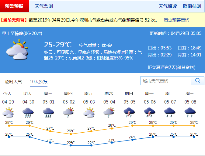 市氣象臺預(yù)測,“五一”假期其余時間(2-4日)多云為主,可見陽光,間中有短時陣雨,其中2-3日沿海和高地東風強勁,最大陣風8級左右。市氣象臺提醒市民,深圳已進入強對流天氣多發(fā)期,需留意最新預(yù)警預(yù)報信息,注意提前防范局地短時強降雨、雷雨大風和冰雹造成的災(zāi)害,遠離戶外廣告牌、臨時建筑、低洼地和涵洞等排水不暢地區(qū)。