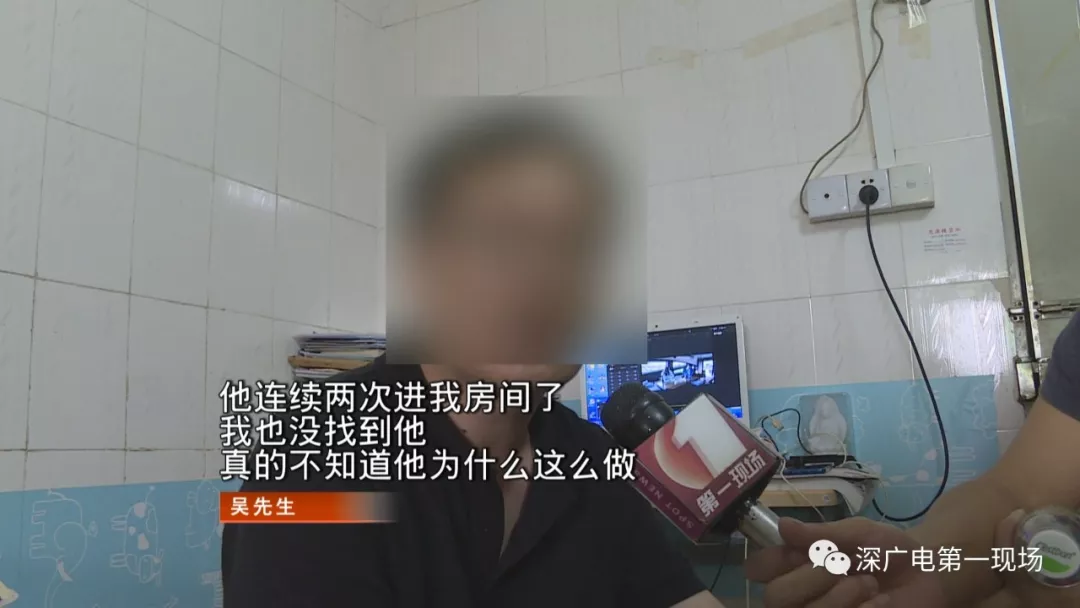 被驚醒的吳先生發(fā)現(xiàn)后,男子在7點(diǎn)19分離開吳先生房間??吹竭@兩段監(jiān)控,吳先生有點(diǎn)后怕。