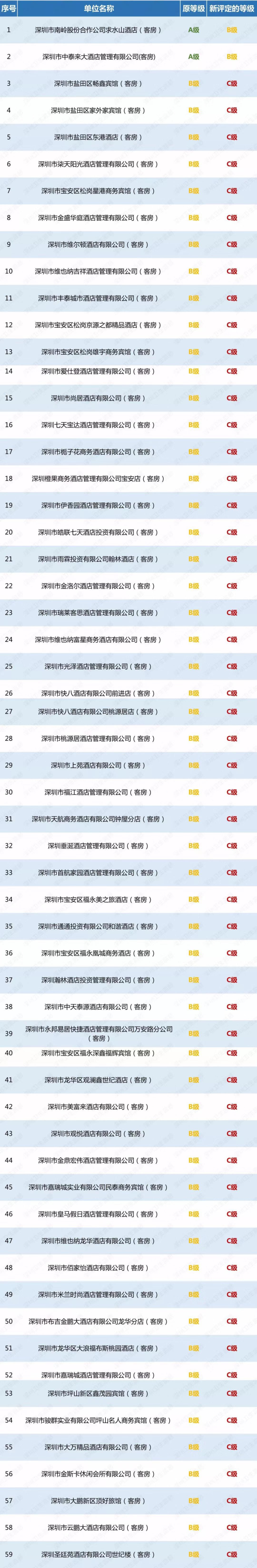 深圳新聞網(wǎng)2019年5月6日訊(記者 劉夢婷)日前,記者從深圳的衛(wèi)監(jiān)局獲悉,為保障市民和來深旅客的健康權(quán)益,自2018年12月下旬開始,深圳市衛(wèi)生監(jiān)督部門集中開展專項(xiàng)整治行動,行動中共檢查1660家酒店業(yè)單位,責(zé)令限期整改224家,立案95宗,共有59家單位在衛(wèi)生信譽(yù)等級評定復(fù)審工作中,被予以“降級”。據(jù)了解,2家原衛(wèi)生量化A級單位被降為B級,57家原衛(wèi)生量化B級單位被降為C級,其中不乏部分知名連鎖酒店業(yè)單位,如七天、維也納等品牌。
