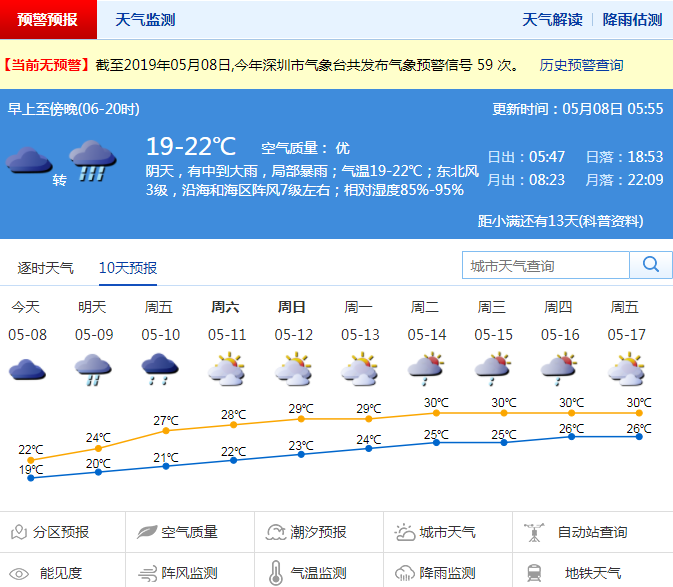 深圳新聞網(wǎng)2019年5月8日訊 6日夜間我市出現(xiàn)局部暴雨,伴有零散雷暴。全市平均雨量33.3毫米,全市最大雨量74.4毫米,出現(xiàn)在南山區(qū)大墈站,我臺先后在全市陸地和海區(qū)發(fā)布了雷電和暴雨黃色預(yù)警信號。受降雨影響,早晨最低氣溫19-20℃,白天最高氣溫僅僅22℃左右,不僅“入夏失敗”,不少市民還感覺“入秋”了。未來兩天仍舊體感陰涼。