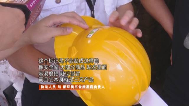 在新環(huán)美五金批發(fā)店,銷售的所有安全帽,除了寫有一個(gè)“安鑒”的字樣外,就再?zèng)]有任何標(biāo)識(shí),而且“安鑒”標(biāo)志粘貼也不符合規(guī)范,明顯也屬于三無(wú)產(chǎn)品。