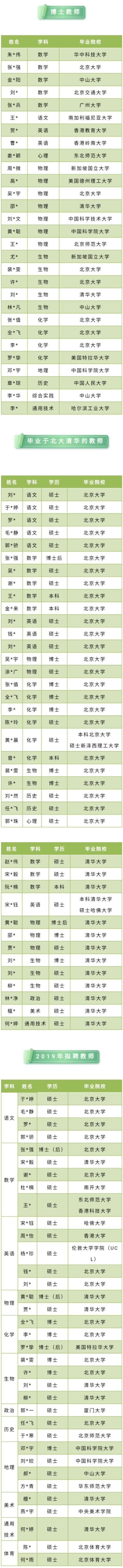 除了該份名單,深圳中學(xué)還公布了目前該校擁有的畢業(yè)于北大、清華的教師名單。其中畢業(yè)于北大的26人、畢業(yè)于清華的13人,39人中本科學(xué)歷為4人、碩士學(xué)歷為25人、博士為8人、博士后2人。