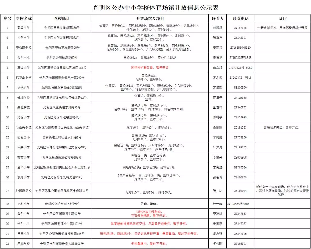 注意:光明區(qū)高級中學(xué)、光明中學(xué)是全寄宿制學(xué)校,學(xué)校體育場館設(shè)施只在寒暑假對外開放