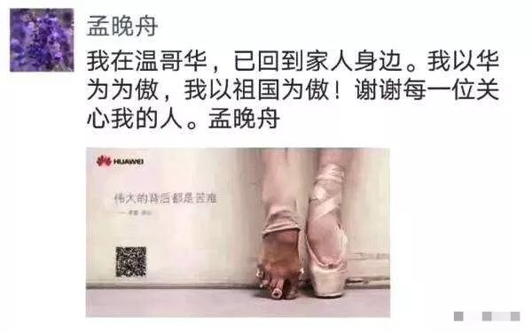 當(dāng)?shù)貢r(shí)間2018年12月1日,加拿大當(dāng)局應(yīng)美方要求,扣留了在加拿大機(jī)場(chǎng)轉(zhuǎn)機(jī)的孟晚舟,美國(guó)隨后承認(rèn),正在尋求對(duì)孟晚舟的引渡。10天之后,2018年12月11日,加拿大法院作出裁決,批準(zhǔn)孟晚舟的保釋申請(qǐng)。當(dāng)晚,走出法庭的孟晚舟發(fā)朋友圈表示,我以華為為傲,我以祖國(guó)為傲。配圖就是那張“芭蕾腳”的華為廣告圖,上面寫著:偉大的背后都是苦難。外界擔(dān)心,由于不斷升級(jí)的中美貿(mào)易摩擦,可能會(huì)影響到孟晚舟在加拿大的引渡訴訟。