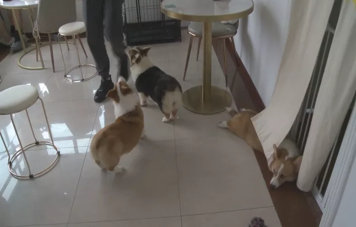 根據(jù)小區(qū)業(yè)主指引,記者來到小區(qū)13層的一家狗狗咖啡廳,可以看到,門口并沒有任何招牌,不過大門打開后,可以看到經(jīng)營場所有兩層,里面有餐桌凳子,有收銀臺,另外還有四只小型寵物犬。