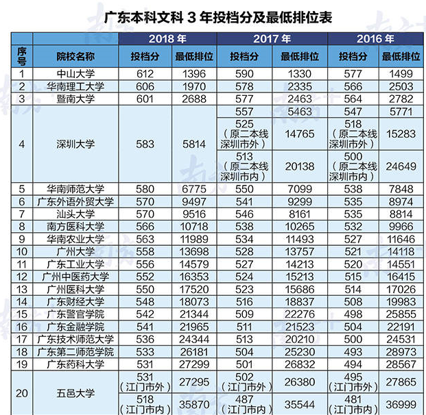 只能給大家找來廣東本科文理科3年投檔分和最低排位表!(部分)
