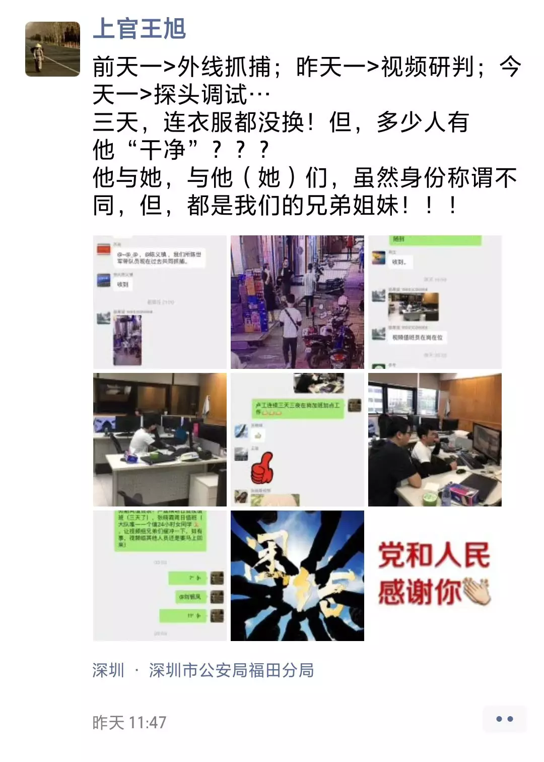 ▲福田派出所輔助人員朱峰朋友圈
