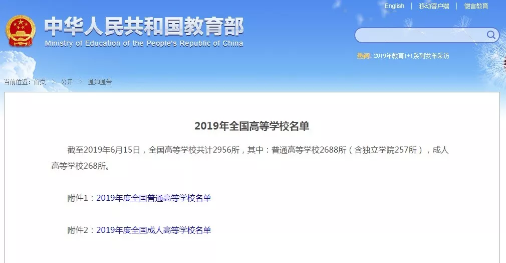 近日,教育部發(fā)布了《2019年全國高等學校名單》,截至2019年6月15日,全國高等學校共計2956所,其中普通高等學校2688所(含獨立學院257所),成人高等學校268所。