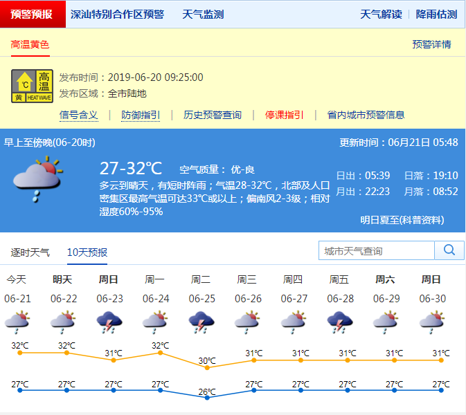 市氣象臺(tái)預(yù)測(cè),深圳6月22日多云炎熱,有短時(shí)雷陣雨,最高氣溫32~34℃;23日-24日多云間陰天,有雷陣雨。