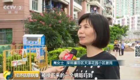 深圳福田區(qū)天澤花園小區(qū)居民常女士:我自己本人曾經(jīng)就在這下邊,被掉下來的一個鋼筋嚇到,當時離這個鋼筋掉下來的位置就只有兩米遠。