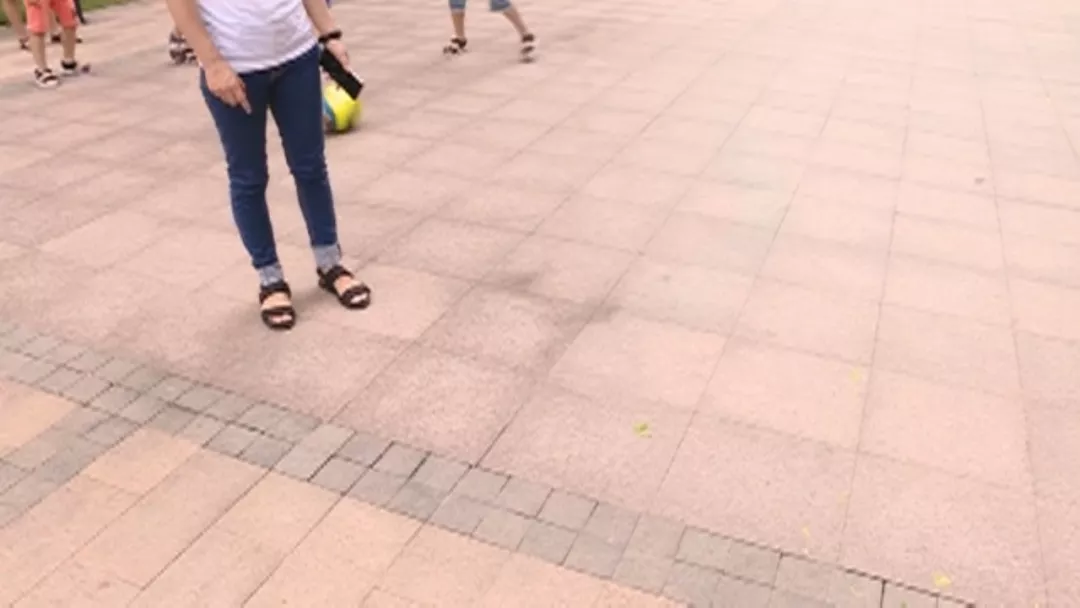 她正帶著兒子在樓下的廣場活動