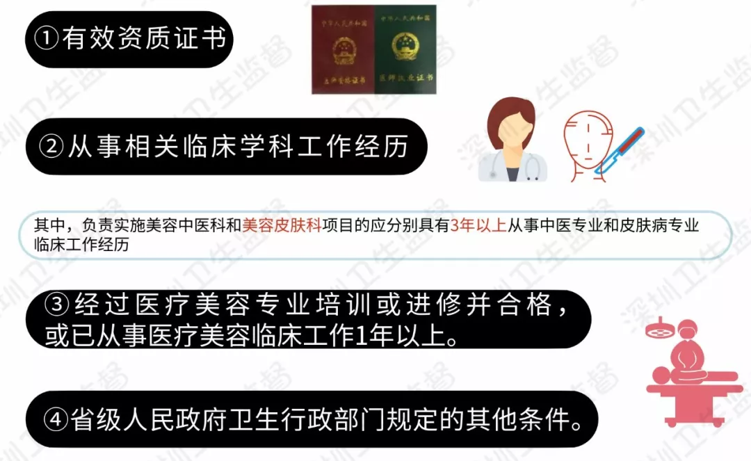 (二)具有從事相關(guān)臨床學(xué)科工作經(jīng)歷。其中,負(fù)責(zé)實(shí)施美容外科項(xiàng)目的應(yīng)具有6年以上從事美容外科或整形外科等相關(guān)專業(yè)臨床工作經(jīng)歷;負(fù)責(zé)實(shí)施美容牙科項(xiàng)目的應(yīng)具有5年以上從事美容牙科或口腔科專業(yè)臨床工作經(jīng)歷;負(fù)責(zé)實(shí)施美容中醫(yī)科和美容皮膚科項(xiàng)目的應(yīng)分別具有3年以上從事中醫(yī)專業(yè)和皮膚病專業(yè)臨床工作經(jīng)歷;(三)經(jīng)過(guò)醫(yī)療美容專業(yè)培訓(xùn)或進(jìn)修并合格,或已從事醫(yī)療美容臨床工作1年以上;(四)省級(jí)人民政府衛(wèi)生行政部門(mén)規(guī)定的其他條件。