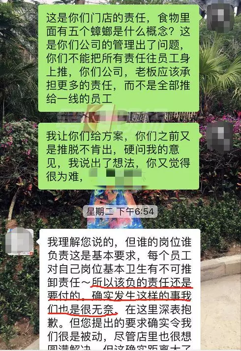 康先生拍了現(xiàn)場的照片,因?yàn)楦糁w,可以看到有多個(gè)小黑點(diǎn),但很難一眼辨認(rèn)出是小蟑螂。不過,從康先生提供的微信聊天記錄可以看出,店方承認(rèn)他們員工有疏忽,也派負(fù)責(zé)人跟康先生溝通賠償問題。康先生表示店家愿意賠償1000元,但他感覺對自己的精神影響很大,并不同意。