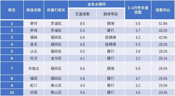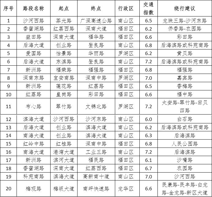 晚高峰十大交通運(yùn)行惡化街道:翠竹、筍崗、福保、蓮花、沙頭、民治、華強(qiáng)北、福田、蛇口、招商。