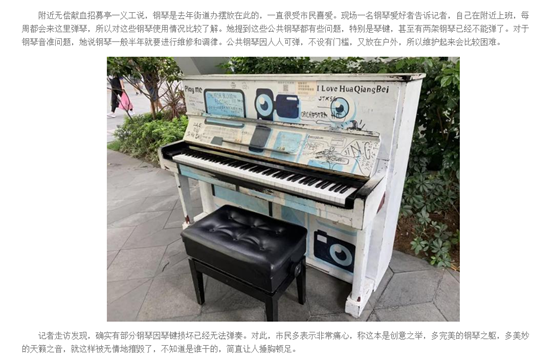 不知你們發(fā)現(xiàn)沒有,在華強北地鐵口以及周邊的空曠遮蔭處,擺放了8架鋼琴,市民可以免費使用。