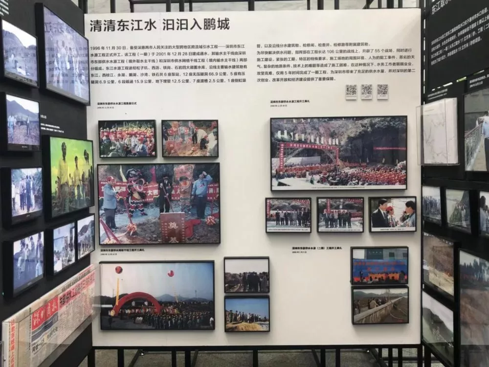 第三部分“清清東江水汩汩入鵬城”,著重展示東江水源工程建設(shè)的全過程。以工程線路為展覽線索,再現(xiàn)水務(wù)工作者在長達(dá)106公里的戰(zhàn)線上奮戰(zhàn)的場(chǎng)面。通過輸水設(shè)施的新舊照片對(duì)比,描繪出一條在深惠兩城平地崛起的深圳“生命線”。