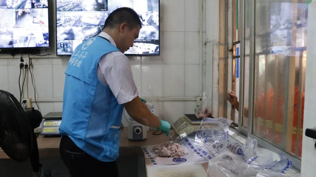 執(zhí)法人員根據(jù)市場開辦方提供的市場檔位明細表,首先隨機選取了市場內的肉檔、水產品檔、菜檔,逐一進行檢查,對檔位的營業(yè)執(zhí)照、臺賬建立情況檢查無誤后,執(zhí)法人員又隨機指定了檢查品種,由快檢人員現(xiàn)場開展快檢工作。