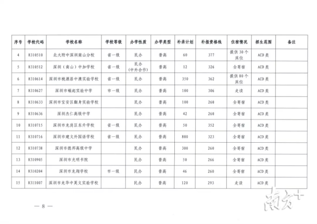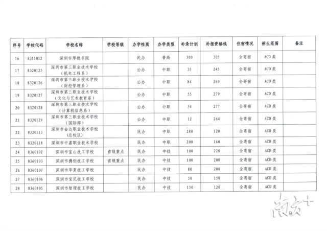 記者梳理發(fā)現(xiàn),目前,深圳市共有16所普高尚有擴招及補錄計劃,補錄人數(shù)2430人,最高補錄分數(shù)線為377分。此外,全市還有4所中職學校與7所中技學校進行擴招與補錄,補錄人數(shù)共1367人,最高補錄分數(shù)線為316分。