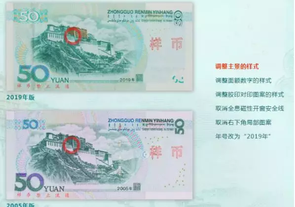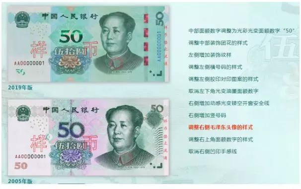 2019年版第五套人民幣50元、20元、10元、1元紙幣分別保持2005年版第五套人民幣50元、20元、10元紙幣和1999年版第五套人民幣1元紙幣規(guī)格、主圖案、主色調(diào)、“中國(guó)人民銀行”行名、國(guó)徽、盲文面額標(biāo)記、漢語(yǔ)拼音行名、民族文字等要素不變,提高了票面色彩鮮亮度,優(yōu)化了票面結(jié)構(gòu)層次與效果,提升了整體防偽性能。2019年版第五套人民幣50元、20元、10元、1元紙幣調(diào)整正面毛澤東頭像、裝飾團(tuán)花、橫號(hào)碼、背面主景和正背面面額數(shù)字的樣式,增加正面左側(cè)裝飾紋樣,取消正面右側(cè)凹印手感線(xiàn)和背面右下角局部圖案,票面年號(hào)改為“2019年”。