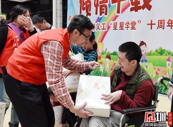 “星星學(xué)堂”十周年慶上,張楠為光仔送上禮物。(受訪者供圖)