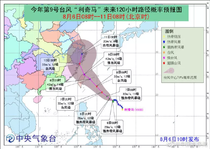 預(yù)計,“利奇馬”將以每小時5公里左右的速度緩慢向西北方向移動,強度逐漸增強,最強可達臺風級或強臺風級(12-14級,35-45米/秒),逐漸向我國東南沿??拷?。未來兩天對我國近海海域無影響。