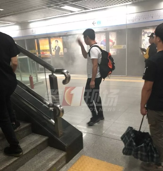 ▲地鐵工作人員用滅火器撲滅爆燃充電寶