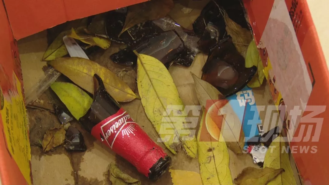 ▲險(xiǎn)些傷人的啤酒瓶,砸落后已破碎