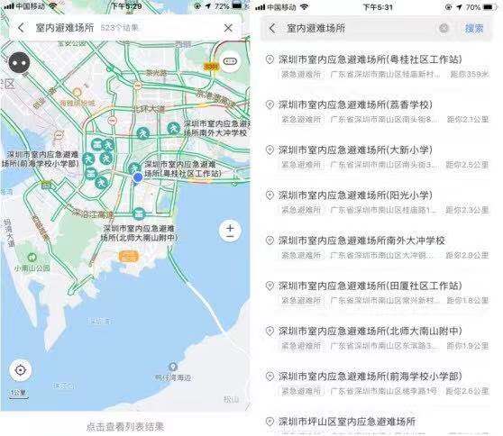 目前,深圳市已建成的592處室內(nèi)應(yīng)急避難場所位置信息已經(jīng)標注在騰訊地圖上。深圳市民可在騰訊地圖APP端,或在“騰訊地圖+”微信小程序中,搜索“室內(nèi)應(yīng)急避難場所”,獲取附近所有室內(nèi)應(yīng)急避難場所的地理位置、名稱、地址、緊急聯(lián)系電話等信息,同時可一鍵導航,盡快抵達。