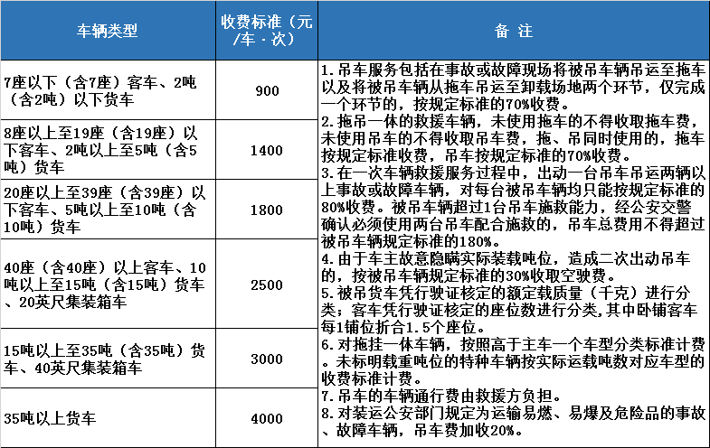 廣東省高速公路吊車服務(wù)收費標準見下表: