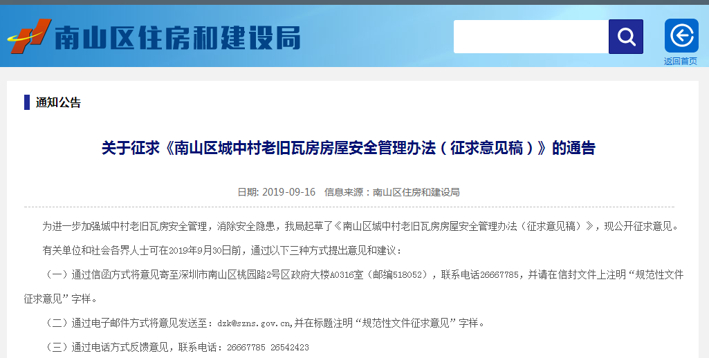 意見稿征集截止至9月30日,有關(guān)單位和社會(huì)各界人士有意見或建議的要及時(shí)進(jìn)行反饋,更多情況可以登錄南山區(qū)住建局官網(wǎng)進(jìn)行查看。